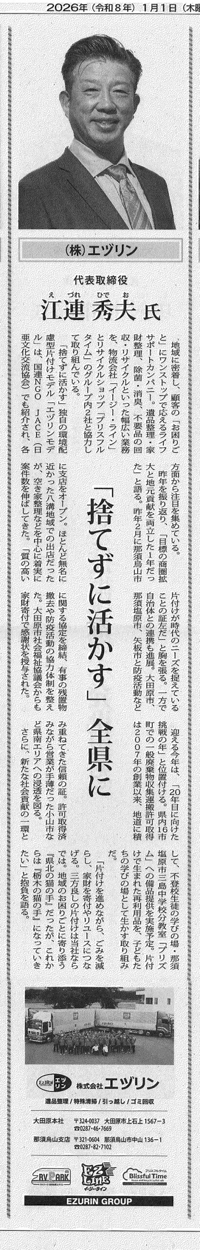 下野新聞 2026年1月1日「新春トップインタビュー」に、当社江連代表のインタビューが掲載されました。